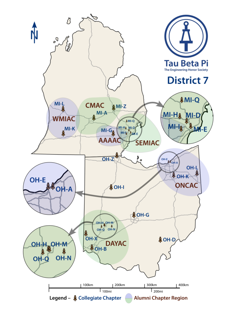 District 7 (D7) is one of sixteen districts in Tau Beta Pi, the Engineering Honor Society. As the largest district in number of chapters, we are made up of 24 collegiate chapters chapters as well as 6 active alumni chapters across the lower peninsula of Michigan and all of Ohio.
